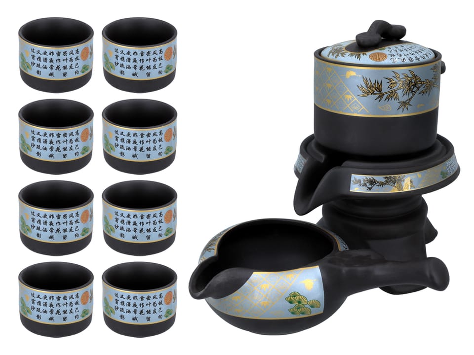 Gustowny, ceramiczny zestaw składający się z czajnika, podgrzewacza i czarek.