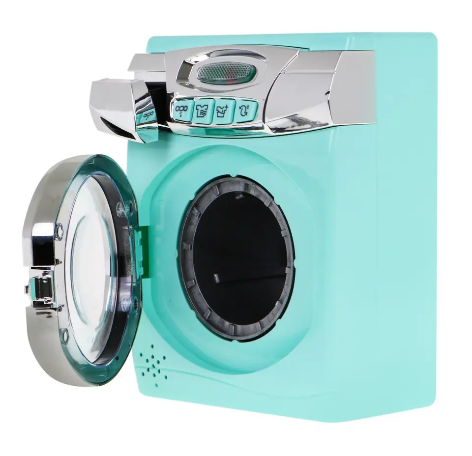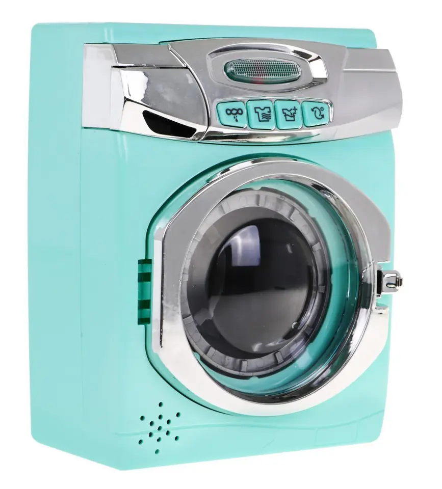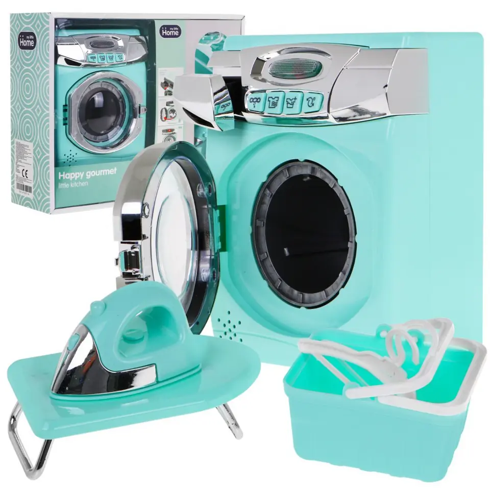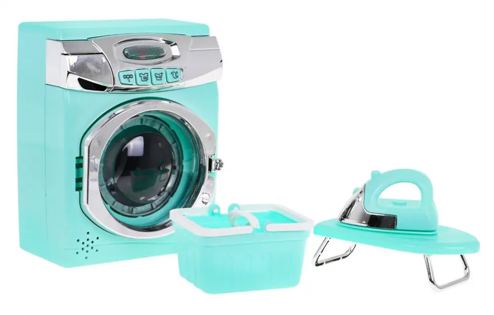 Zestaw interaktywna pralka, deska do prasowania i kosz na bieliznę to propozycja dla wszystkich dzieci, które lubią naśladować swoich rodziców podczas ich codziennych domowych obowiązków. Pralka zasilana jest bateriami typu AA- 3 x 1,5V (brak w zestawie). Posiada efekty dźwiękowe i świetlne. Przyciskami ustala się programy prania i w zależności od programu słychać różne odgłosy pracy pralki oraz świeci się dioda z przodu pralki. Programy prania: - pierwszy i drugi program słychać odgłosy prania, bęben obraca się, - trzeci - odgłos odpompowania wody, - czwarty - odgłosy napełniania wody, bęben pralki wiruje. Pralka posiada otwieraną komorę na detergenty oraz otwierany bęben.