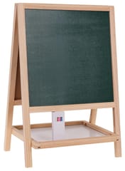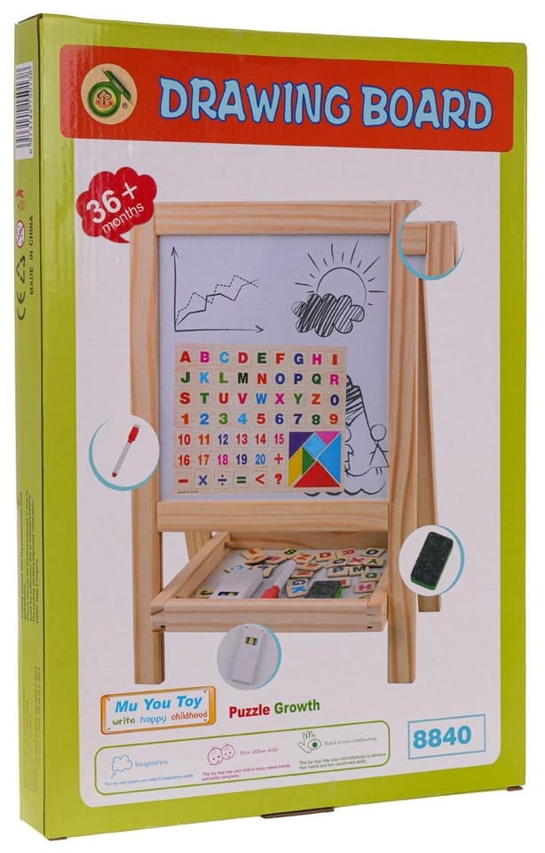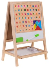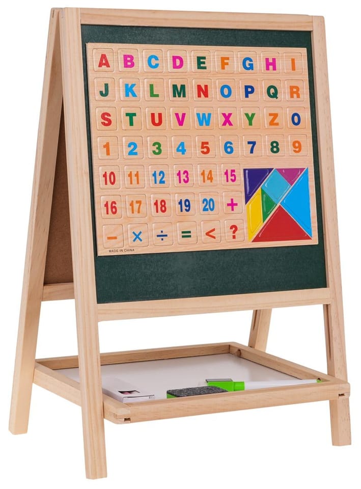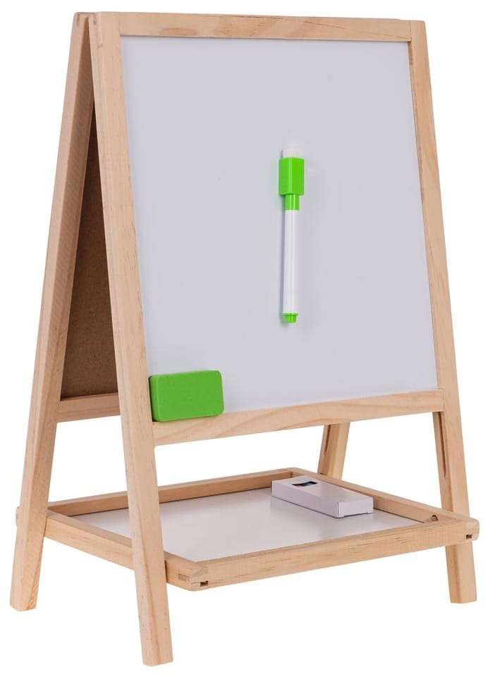 Drewniana dwustronna tablica z akcesoriami dla dzieci powyżej 3-go roku życia. Tablica z jednej strony jest biała i służy do malowania pisakiem dołączonym do zestawu, z drugiej strony zaś jest kredowa, do malowania kredą dołączoną do zestawu. Zarówno po stronie białej jak i kredowej możemy przyczepiać magnesy. Do zestawu dołączono magnesy z literkami, cyframi, działaniami matematycznymi i figurami przestrzennymi. Zestaw wyposażono w praktyczną półeczkę na dole, mieszczącą wszystkie akcesoria. Funkcje zestawu: - odpowiedni dla dzieci powyżej 3-go roku życia, - wykonany z drewna, - dwustronna tablica, kredowa i do malowania pisakiem, - tablica z dwóch stron jest magnetyczna, - praktyczna półeczka na akcesoria, - w zestawie znajduje się kreda, gąbka, pisak, magnesy.