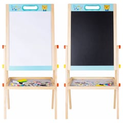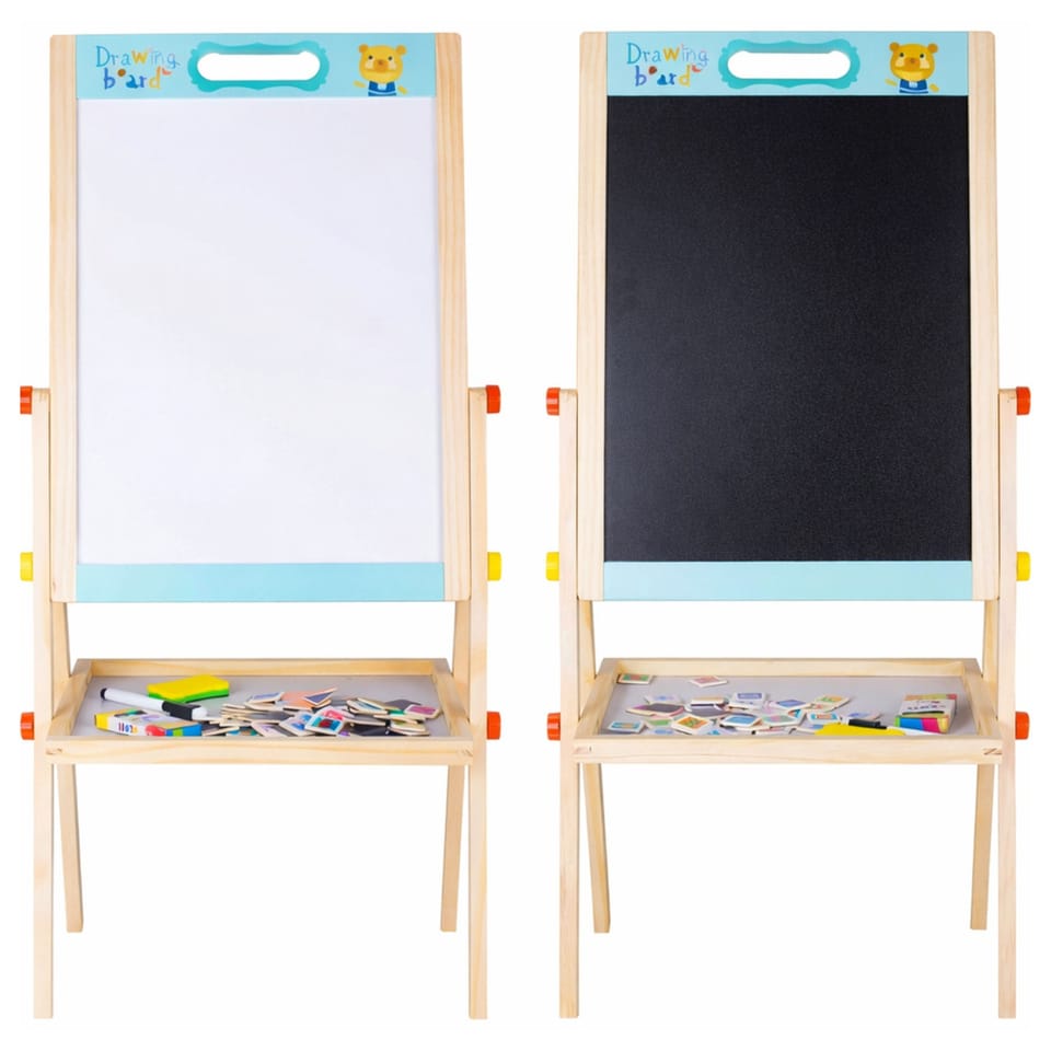 Dwustronna tablica magnetyczna dla dzieci to doskonała pomoc edukacyjna oraz kreatywna zabawka rozwijająca wyobraźnię i zdolności manualne najmłodszych. Tablica posiada dwie powierzchnie do rysowania i nauki. Jedna strona jest biała i magnetyczna, dzięki czemu można pisać po niej markerem suchościeralnym oraz korzystać z magnetycznych literek, cyfr i kształtów. Druga strona jest czarna i przeznaczona do rysowania kredą.