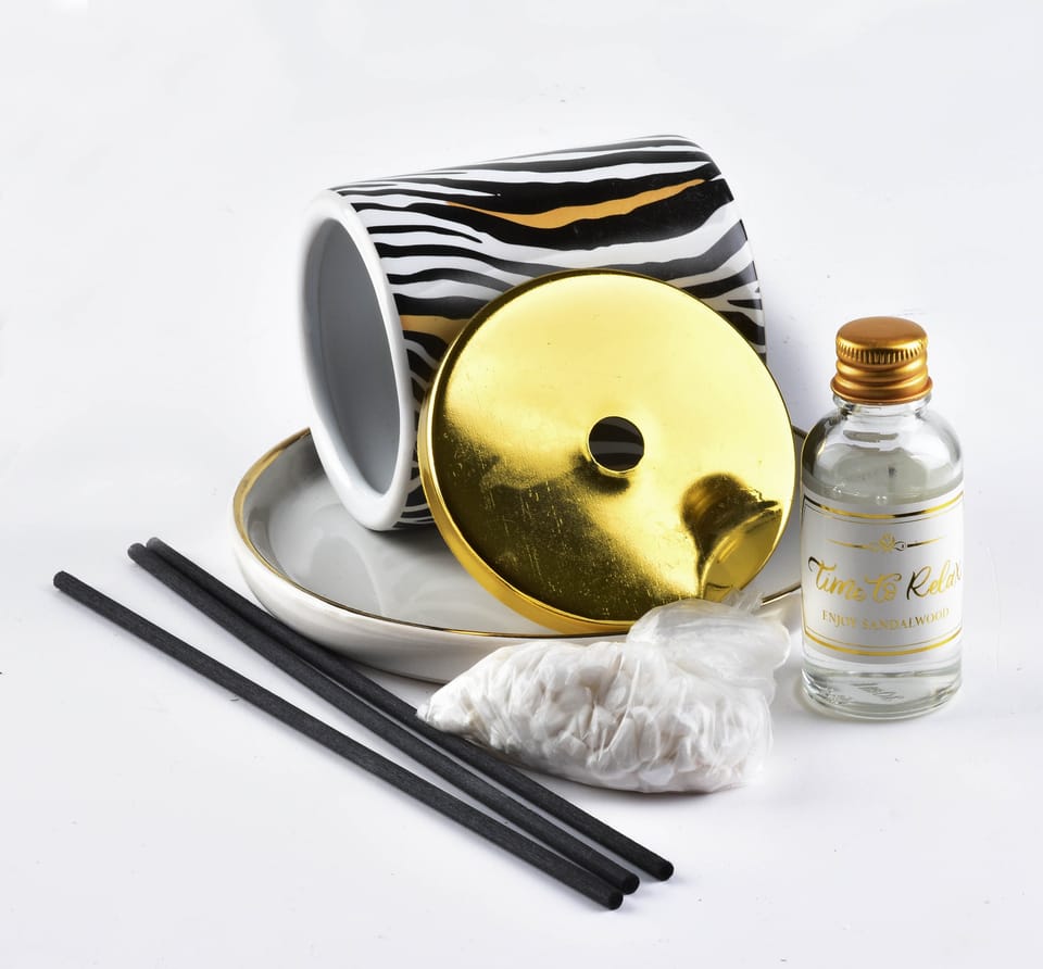 Dyfuzor zapachowy śr.7,5xH:9cm z pokrywką z podstawką 14cmxH:2cm olejkiem zapachowym 30 ml Zestaw zapachowy marki MONDEX since 1986. Nadaj piękny zapach swojemu domowi lub spraw radość swoim bliskim. Zestaw prezentowy we wzór zebry. Odpowiednio dobrany zapach do wnętrz uspokaja i zapewnia dobry nastrój, sprawiając, że każde pomieszczenie staje się komfortowe przytulne. Właściwości: zapach drzewo sandałowe korzenny aromat doskonały pomysł na prezent Zawartość zestawu: dyfuzor zapachowy + patyczki olejek zapachowy drzewo sandałowe 30ml kamyczki ozdobne ZAWIERA INSTRUKCJĘ BEZPIECZEŃSTWA i UŻYTKOWANIA - KONIECZNOŚĆ ZAPOZNANIA SIĘ. WYMIARY: ŚREDNICA 7.5CM WYSOKOŚĆ Z POKRYWKĄ 9CMSPODEK: ŚREDNICA 14CM WYSOKOŚĆ 2CMOPAKOWANIE :BIAŁY KARTON OLEJEK 30ML