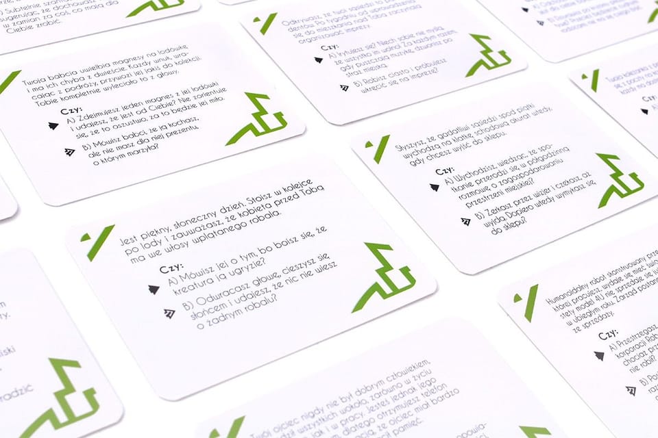 Zapraszamy do gry moralnych dylematów i trudnych wyborów. Usiądźcie w kręgu w grupie od 4 do 15 osób i rozdajcie każdemu z graczy po 2 karty do głosowania (A oraz B). Wybierzcie talię, którą będziecie grali oraz tego, kto rozpocznie zabawę.