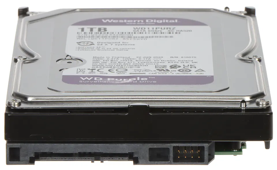 Dyski twarde WD Purple klasy surveillance oferują unikatową technologię AllFrame 4K, która w połączeniu z mechanizmem transmisji strumieniowej ATA pomaga ograniczyć zjawisko „wypadania” klatek wideo, podnosi jakość odtwarzanego obrazu i umożliwia obsługę większej liczby dysków w środowisku NVRDyski przystosowane są do obciążenia nawet 180 TB rocznie – trzykrotnie wyższego w porównaniu ze standardowymi dyskami przeznaczonymi dla komputerów stacjonarnychDyski te są dedykowane do rejestracji wideo HD w trybie ciągłym 24/7 oraz posiadają zmniejszone zużycie energiiPodłączany jest za pomocą złącza Serial ATA