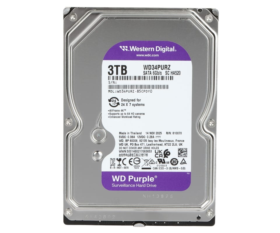 Dyski twarde WD Purple klasy surveillance oferują unikatową technologię AllFrame 4K, która w połączeniu z mechanizmem transmisji strumieniowej ATA pomaga ograniczyć zjawisko „wypadania” klatek wideo, podnosi jakość odtwarzanego obrazu i umożliwia obsługę większej liczby dysków w środowisku NVRDyski te są dedykowane do rejestracji wideo HD w trybie ciągłym 24/7 oraz posiadają zmniejszone zużycie energiiPodłączany jest za pomocą złącza Serial ATA