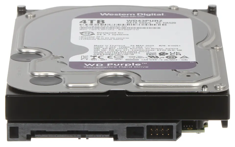 Dyski twarde WD Purple klasy surveillance oferują unikatową technologię AllFrame 4K, która w połączeniu z mechanizmem transmisji strumieniowej ATA pomaga ograniczyć zjawisko „wypadania” klatek wideo, podnosi jakość odtwarzanego obrazu i umożliwia obsługę większej liczby dysków w środowisku NVRDyski przystosowane są do obciążenia nawet 180 TB rocznie – trzykrotnie wyższego w porównaniu ze standardowymi dyskami przeznaczonymi dla komputerów stacjonarnychDyski te są dedykowane do rejestracji wideo HD w trybie ciągłym 24/7 oraz posiadają zmniejszone zużycie energiiPodłączany jest za pomocą złącza Serial ATA