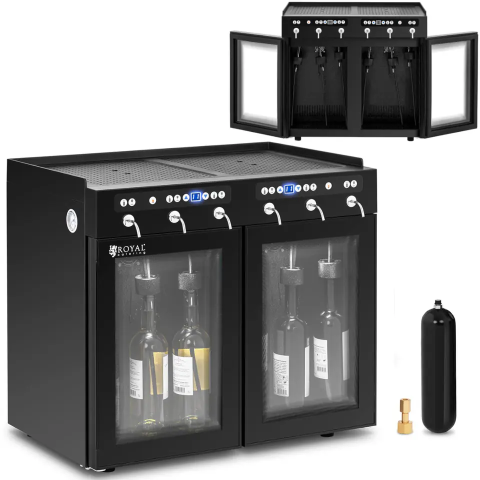 Dyspenser do wina to niezastąpiony sprzęt w restauracjach, hotelach, winiarniach, kawiarniach i pubach. Produkt marki Royal Catering umożliwia jednoczesne schładzanie i dozowanie wina. Optymalna pojemność urządzenia (6 butelek) pozwala umieścić w nim dwa rodzaje trunku. Można je schłodzić do temperatury 7°C. Zakres regulacji wynosi od 7 do 18°C. Dozownik do wina ma moc 120 W i wykorzystuje czynnik chłodniczy R600a. Dozownik wyposażono w 6 kraników (osobny dla każdej butelki) i strefę chłodniczą z wyświetlaczem LED pokazującym temperaturę. Porcja wynosi od 1 do 99 ml. Wino w dozowniku zachowuje swoją świeżość i walory smakowe aż do 30 dni od otwarcia.
