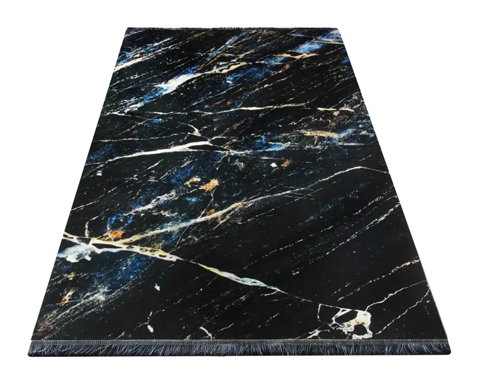 Oryginalny dywan z kolekcji Black&Gold w kolorze czarno-złotym z charakterystycznym wzorem w to fantastyczna propozycja do każdego pomieszczenia. Niebywałą zaletą tych dywanów jest antypoślizgowy spód, dzięki czemu dywan nie będzie się ślizgał po podłodze oraz możliwość prania w pralce w 30 stopniach. Nie zniszczy się oraz nie odkształci. Propozycja dla ludzi ceniących sobie praktyczność oraz bezpieczeństwo. Waga - 1200 g.