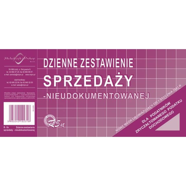 R5H DZIENNE ZESTAWIENIE SPRZEDAŻY - NIEUDOKUMENTOWANEJ (DLA PODATNIKÓW ZRYCZAŁTOWANEGO PODATKU DOCHODOWEGO) * format: 1/3 A4 * rodzaj papieru: offsetowy * zastosowanie: podatnicy zryczałtowanych form opodatkowania podatkiem dochodowym * oprawa: bloczek 50 kartek * druk: jednostronny