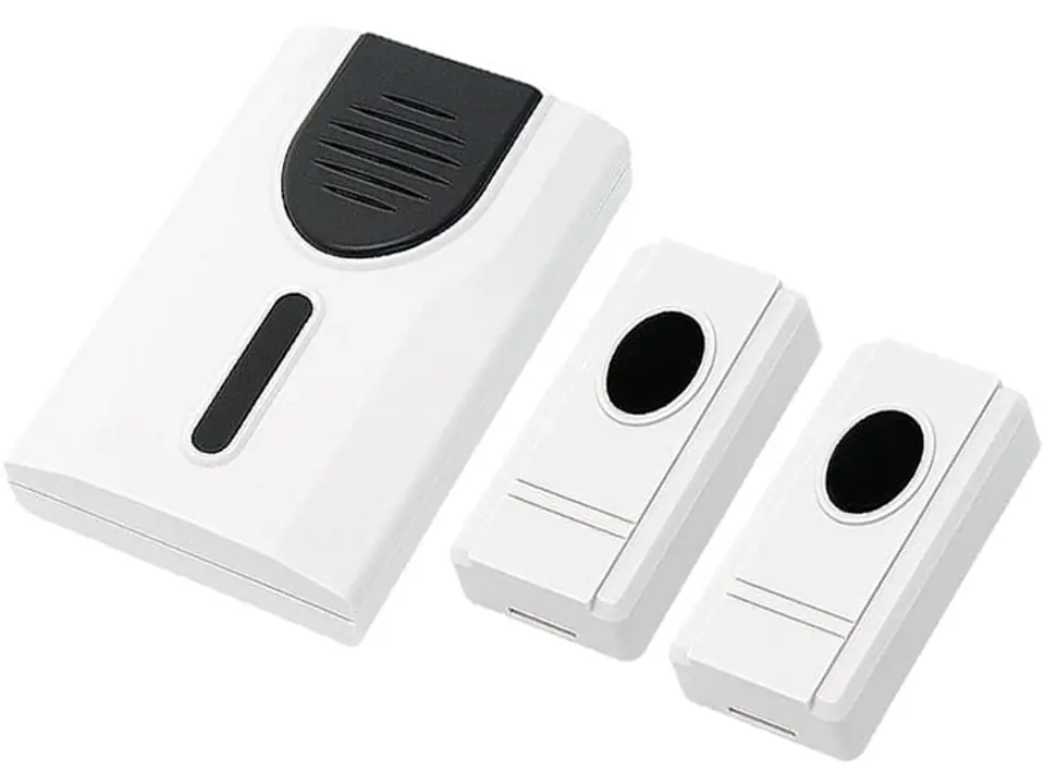 Bezprzewodowy dzwonek z możliwością samodzielnego ustawiania dźwięku. Wybór spośród 3 dostępnych melodii. Konstrukcja nadajnika odporna na wilgoć.