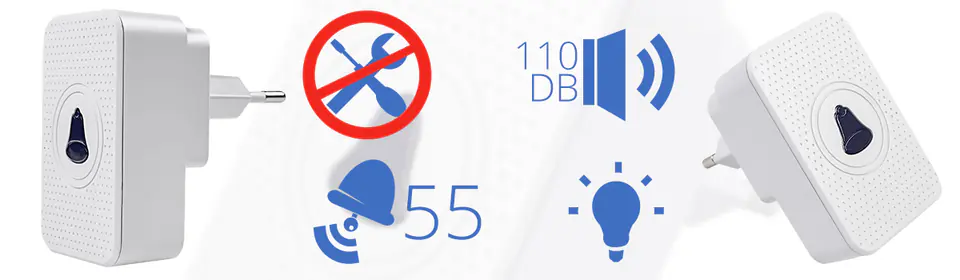 Do zestawu dołączony jest dodatkowy dzwonek/ głośnik, który należy wpiąć do gniazdka sieciowego. To wygodne rozwiązanie, gdy jesteś zajęty w domu, a nie masz telefonu przy sobie. Posiada 5 poziomów głośności do 110 decybeli i aż 55 melodii do wyboru. Dodatkowa lapka LED świeci w momencie dzwonienia. Imponujący jest też zasięg działania, który wynosi do 300m na otwartej przestrzeni