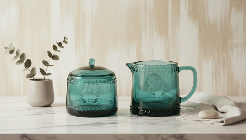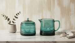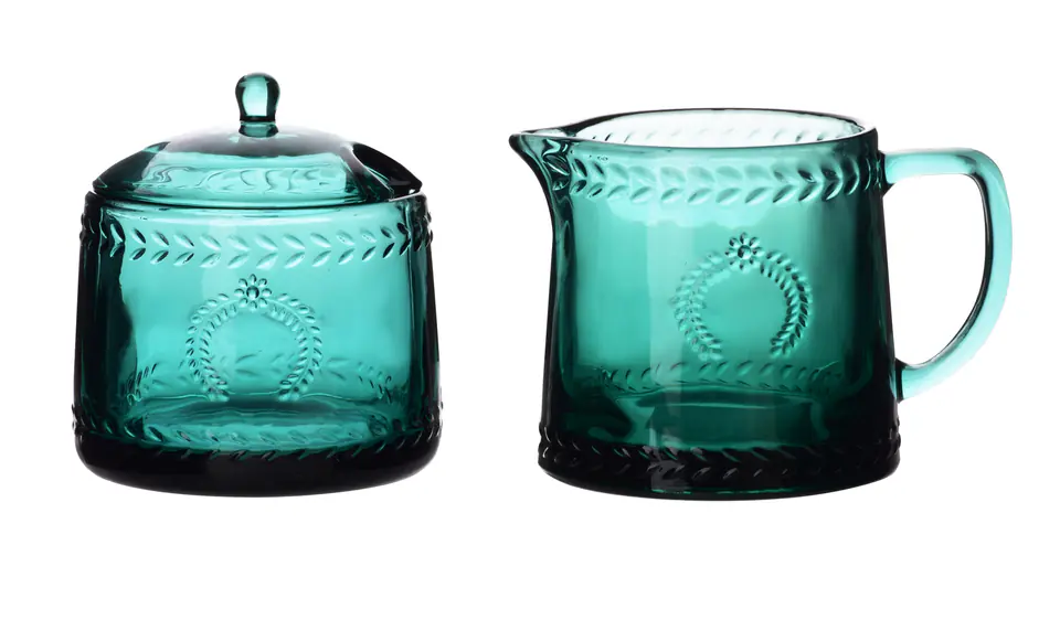 Przepiękny szklany komplet z kolekcji ECILA DARK w odcieniu zieleni z tłoczeniem ozdobnym! Komplet cukiernicy z mlecznikiem idealnie wpasuje się do każdego wnętrza, jadalnisalonu, kuchni. Wykonany ze szkła sodowego, nadaje się do zmywarki, nie nalęzy używać w mikrofali.. cukiernica śr 9xh7,3cm wysokość z pokrywką 10,5cm mlecznik 300ml 12,5x8xh8,7cm opakowanie jednostkowe brązowy karton:20x10xh10cm