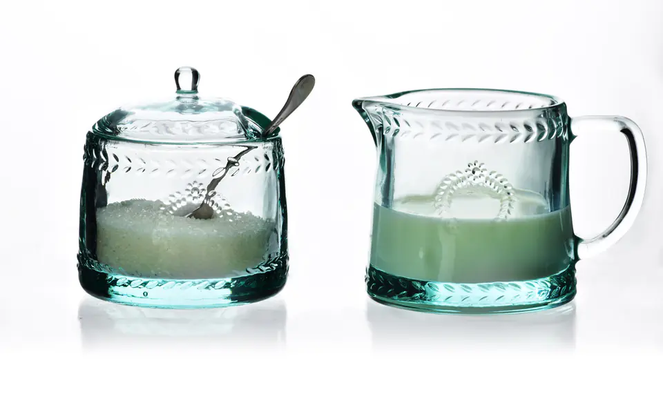 Przepiękny szklany komplet w odcieniu lekkiego turkusu z tłoczeniem ozdobnym! Komplet cukiernicy z mlecznikiem idealnie wpasuje się do kązdego wnętrza, jadalni salonu, kuchni.Wykonany ze szkła sodowego, nadaje się do zmywarki, nie należy używać w mikrofali.cukiernica śr 9xh7,3cmwysokość z pokrywką 10,5cm mlecznik 300ml12,5x8xh8,7cmopakowanie:20x10xh10cmZacznijmy od cukiernicy, prawdziwego ucieleśnienia wyrafinowania. Wykonana ze staranną dbałością o szczegóły, jej wymiary 9xh7,3 cm doskonale zachowują równowagę między dużą pojemnością a wygodnym rozmiarem. Niezależnie od tego, czy wolisz wyrafinowane kostki, niebiańskie granulki, czy sproszkowaną doskonałość, ta cukiernica jest tutaj, aby zaspokoić wszystkie Twoje słodkie pragnienia. Fachowo zaprojektowana pokrywka bez trudu uszczelnia wszystkie rozkoszne smaki, zapewniając, że słodkie przysmaki pozostaną świeże i nieskażone. Jednym ruchem nadgarstka pokrywka odsłania świat błogiej rozkoszy, zapraszając do zanurzenia się w słodkim raju. Zwróćmy teraz uwagę na śmietankę, harmonijnego towarzysza cukiernicy. Dzięki dużej pojemności 300 ml, śmietanka jest gotowa towarzyszyć porannym rytuałom picia kawy lub popołudniowym spotkaniom przy herbacie z niezrównaną gracją. Jego elegancki i opływowy kształt doskonale komponuje się z każdym nakryciem stołu, emanując wyrafinowaniem, które podniesie jakość wszystkich napojów. Wykonany z najwyższą starannością, zabielacz zapewnia płynne nalewanie, pozwalając niebiańskiemu strumieniowi aksamitnej śmietanki spłynąć kaskadą do filiżanki, przekształcając ją w płótno smakowitej doskonałości.