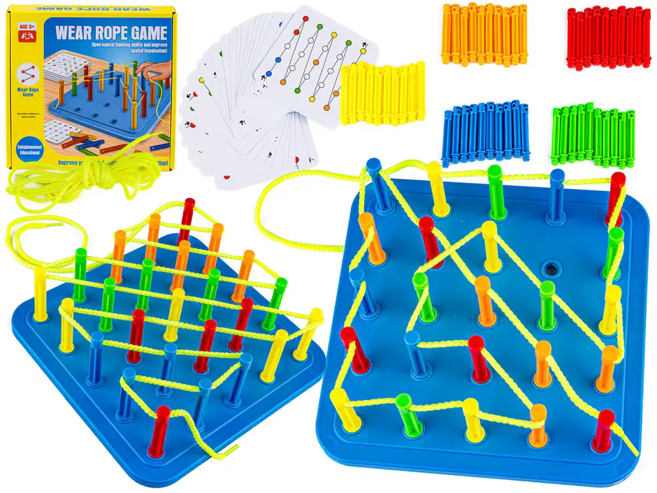 Zestaw zawiera:2 plansze - podstawy gry,2 sznurki,30 kart z zadaniami, 10 patyczków w kolorze żółtym,10 patyczków w kolorze zielonym,10 patyczków w kolorze niebieskim,10 patyczków w kolorze pomarańczowym,10 patyczków w kolorze czerwonym,Oryginalne opakowanie.