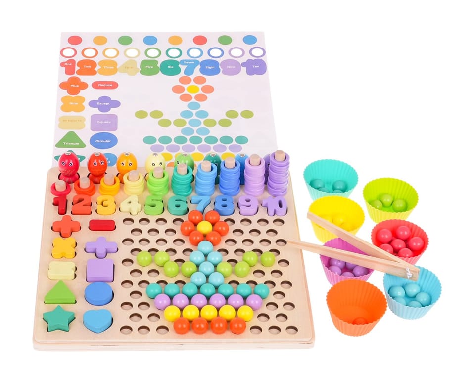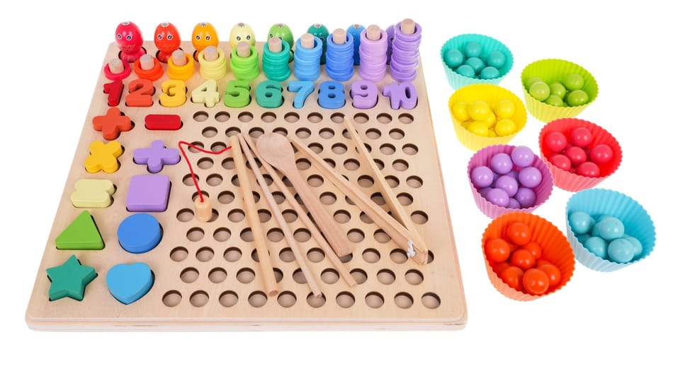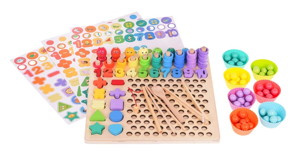 | Drewniany edukacyjny zestaw gier to propozycja dla dzieci od 3-go roku życia. Zestaw wykonany został z drewna, jest bezpieczny i wytrzymały. Ten zestaw daje mnóstwo możliwości do zabawy i nauki. Można łowić rybki, liczyć, sortować, dopasowywać, układać kulki w obrazki, zbierać kulki do babeczek lub układać równania matematyczne. Góra układanki to gra zręcznościowa z łowieniem rybek. Rybki mają magnesy, należy je ułożyć za pomocą wędki w otworach na podstawie. Kolejny rząd to drewniane słupki, na które należy zakładać kolorowe plastikowe kółeczka. Niżej znajdują się numerki od 1 do 10, dziecko musi dopasować numerek do odpowiedniego wgłębienia na podstawie. Na samym końcu znajdują się wgłębienia na kolorowe drewniane koraliki a po boku figury i znaki matematyczne. Do zestawu dołączono również kolorowe foremki na babeczki, do których można przekładać kulki, można to robić za pomocą szczypców, łyżeczki lub patyczków. Zestaw rozwija umiejętności manualne, wyobraźnię, zręczność, logiczne myślenie oraz koordynację wzrokowo-ruchową. Jest pomocny przy nauce liczb, prostych działań matematycznych oraz rozpoznawania kolorów. | |