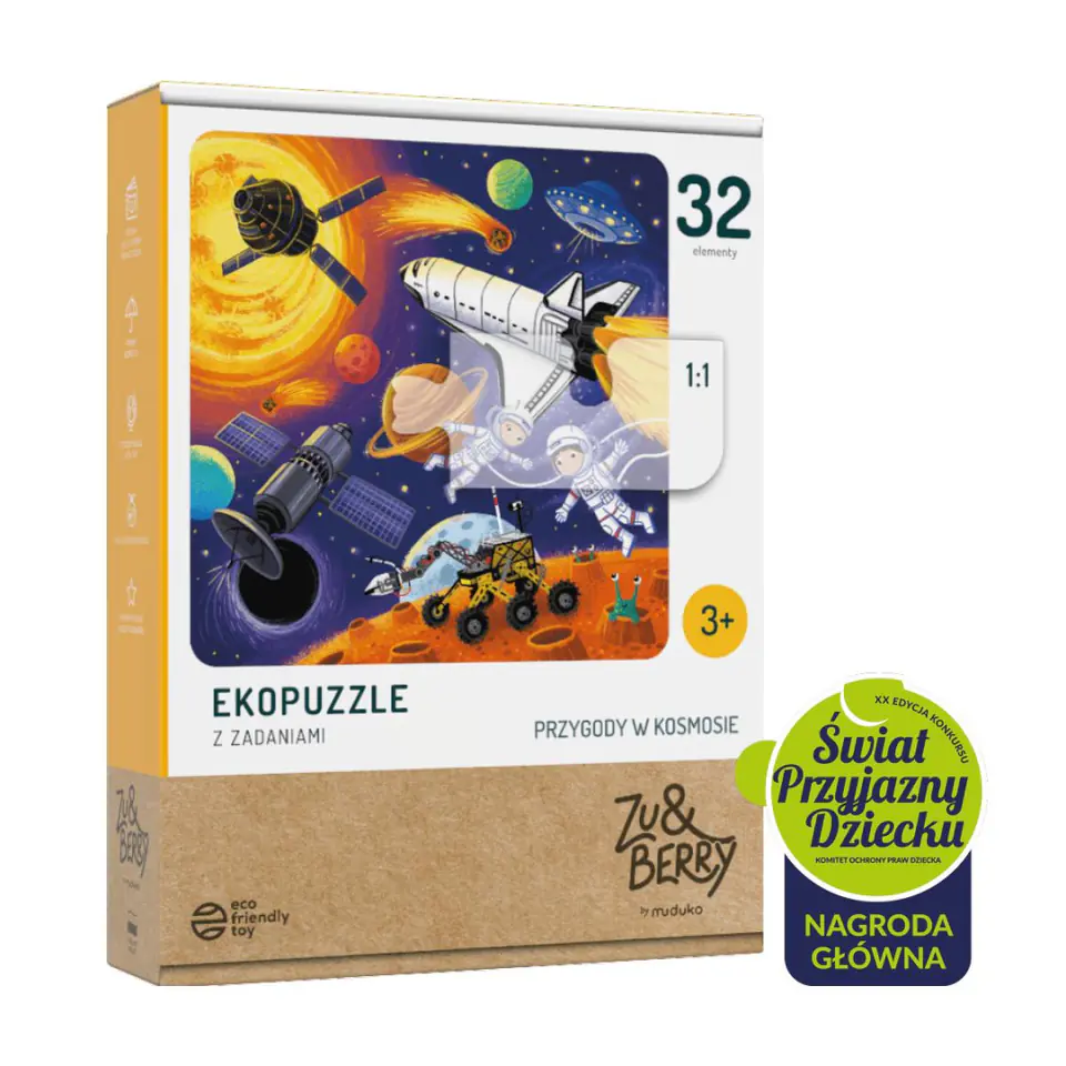 32-elementowy zestaw puzzli ukazujący dwoje dzielnych, młodych astronautów w kosmosie. Układanie puzzli jest dobrym narzędziem wspomagającym motorykę małą u dzieci. Daje okazję do rozmowy o tym, jak wielka jest przestrzeń kosmiczna i jakie próby odkrycia kosmosu podejmują ludzie. Do zestawu dołączone są zadania, które pozwalają ćwiczyć umiejętności liczenia i właściwego nazywania obiektów. Pomocnikami w zabawie są surykatka Zu i alpaka Berry (tekturowe figurki do samodzielnego złożenia).