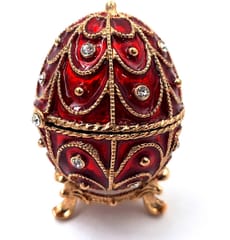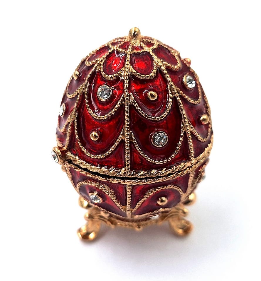 Ekskluzywna metalowa szkatułka z kryształkami - Jajo Fabergé - B0748-17 RD Szukasz wyjątkowego prezentu dla bliskiej osoby? Eleganckie pudełeczko w kształcie jaja Fabergé to połączenie pięknego designu i praktycznego miejsca do przechowywania biżuterii Informacje o produkcie: • Wymiary: 5,5x6,5cm • Materiał: kryształ, metal (cynk), szkliwo • Kolor: czerwono-złoty • Piękne, bogato zdobiona kryształkami szkatułka na biżuterię • Piękne, żywe kolory • Bogate zdobienia