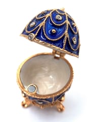 Ekskluzywne metalowa szkatułka z kryształkami - Jajo Fabergé - B0748-17 BL Eleganckie pudełeczko z kryształkami w kształcie jaja Fabergé. Wymiary: 5,5x6,5cm. Idealne na prezent. Informacje o produkcie: • Wymiary: 5,5x6,5cm • Materiał: kryształ, metal (cynk), szkliwo • Kolor: granatowo-złoty • Piękne, żywe kolory • Bogate zdobienia kryształkami