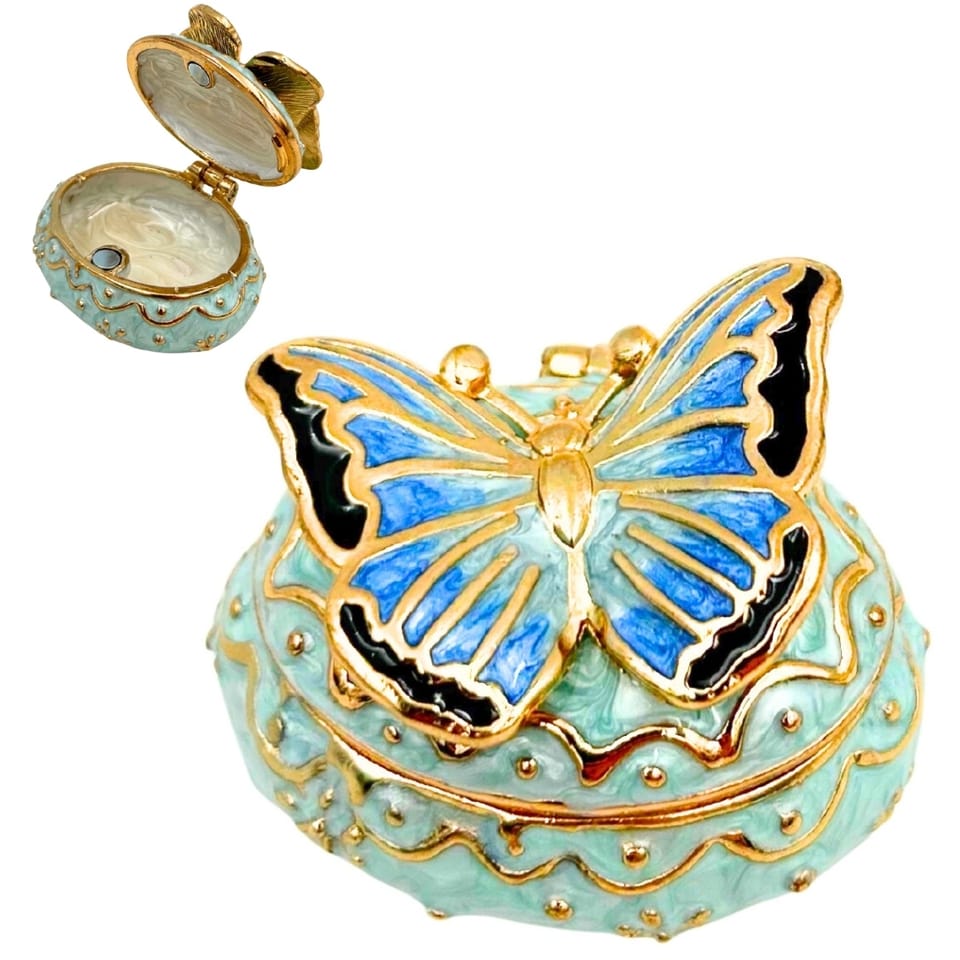 Ekskluzywne Pudełko na Biżuterię Szkatułka - Motylek z Kryształkami - B0782-00BL Ekskluzywne pudełko na kosztowności w kształcie motylka. Wykonane z metalu, szkliwa i kryształków, zachwyca subtelnym blaskiem i kunsztownymi detalami. Idealne jako ozdoba wnętrza lub urocza szkatułka na biżuterię i drobne skarby. Dlaczego warto wybrać nasz produkt: • Bogate zdobienia: lśniące kryształki i szkliwione powierzchnie tworzą efekt luksusu i elegancji. • Uroczy design: motylek symbolizuje lekkość, piękno i wolność – doda wdzięku każdemu wnętrzu. • Wysokiej jakości materiały: wykonanie z metalu (cynk) zapewnia trwałość i odporność na uszkodzenia. • Praktyczne miejsce do przechowywania: otwierane pudełeczko doskonale nadaje się do przechowywania pierścionków lub kolczyków. Informacje o produkcie • Materiał: metal (cynk), kryształ, szkliwo • Kolor: biało-złoty • Wymiary: 3,5 × 5 × 3,5 cm • Zdobienia: kryształki dekoracyjne, szkliwiona powierzchnia • Otwierane pudełeczko na biżuterię lub drobiazgi Doskonały upominek dla: • Dla mamy – subtelny i elegancki symbol miłości i wdzięczności. • Dla żony lub partnerki – romantyczny prezent o wyjątkowym charakterze. • Dla przyjaciółki – uroczy upominek, który zachwyca blaskiem i stylem.