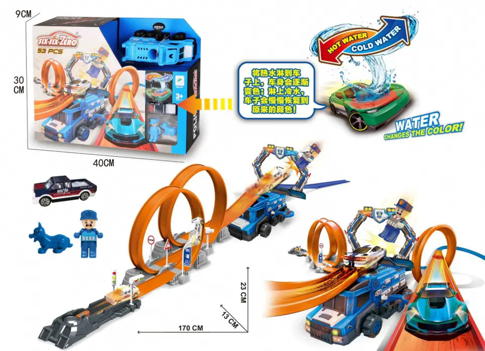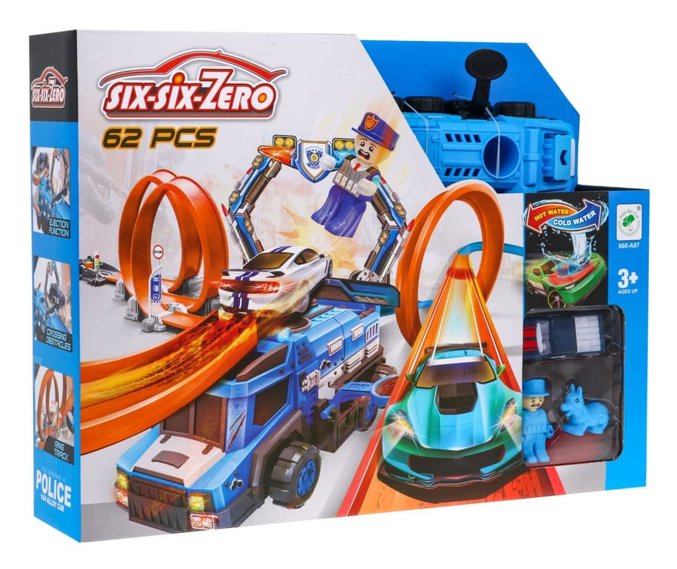 | Ekstremalny, solidnie wykonany tor wyścigowy z dwiema pętlami i samochodzikami w zestawie to propozycja dla dzieci od trzeciego roku życia. Zabawka nie wymaga użycia baterii. Zestaw zawiera dwa pojazdy, dużą ciężarówkę z wyrzutnią oraz pojazd który po zmoczeniu wodą zmienia kolor. Na torze wyścigowym umiejscowiono dwie duże pętle z obrotem pojazdu o 360 stopni oraz różne przeszkody, by zabawa była ciekawsza. Cały zestaw zawiera 62 elementów do samodzielnego montażu. | |