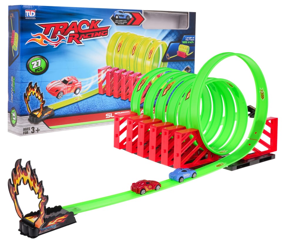 | Ekstremalny tor wyścigowy z sześcioma pętlami i autkami w zestawie to propozycja dla dzieci od 3-go roku życia. Zestaw składa się z 27 elementów. Całkowita długość toru to 185 cm. Na torze znajdują się odcinki proste, pętle oraz wyrzutnia z pętlą „ognia”. Samochodziki posiadają napęd Pull Back, nie wymagają użycia baterii, by jechać. Wystarczy popchnąć delikatnie samochodzik do tyłu, a pomknie do przodu. Pojazd ustawiamy na starcie, po rozpędzeniu go najpierw mknie odcinkiem prostym, potem pokonuje 6 pętli z obrotem 360 stopni, wjeżdża na odcinek prosty, by przefrunąć przez pętle „płomieni”. Autka skonstruowane są z dwóch ruchomych członów, dzięki czemu idealnie dopasowują się do kształtu toru i nie wypadają z niego. Dobra zabawa gwarantowana. | |