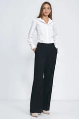 Elegancka biała koszula z kołnierzykiem wykonana z gładkiego i przyjemnego w dotyku materiału. Ma taliowany fason z długimi rękawami, które są zakończone mankietami. Koszula doskonale sprawdzi się w garniturowych stylizacjach – to idealna baza biznesowej garderoby. Skład: 60% bawełna, 40% poliester Modelka na zdjęciu ma 176 cm wzrostu i ma sobie rozmiar 36.