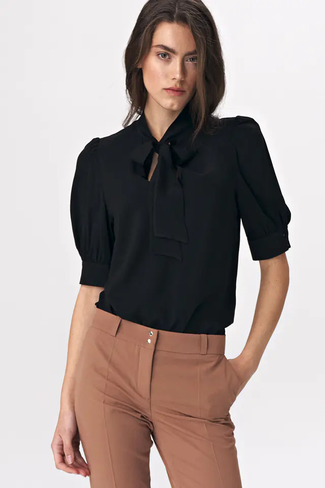 Elegancka czarna bluzka z wiązaniem na dekolcie - B107 kolor czarny, rozmiar 42