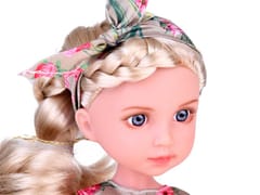 Elegancka lalka w kwiecistej sukience i stylowej opasce na głowie to prawdziwa dama, idealna do towarzyszenia podczas zabawy.