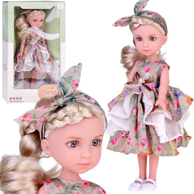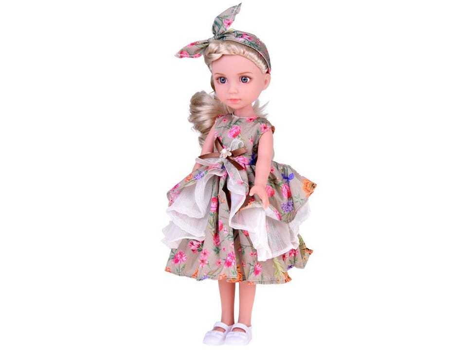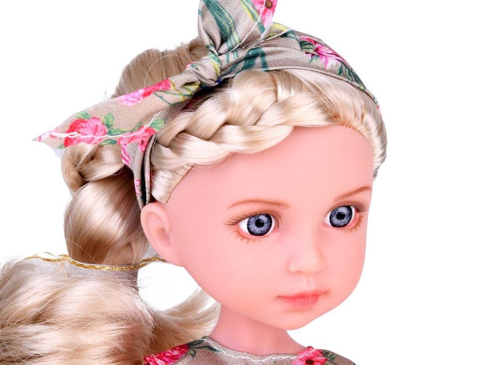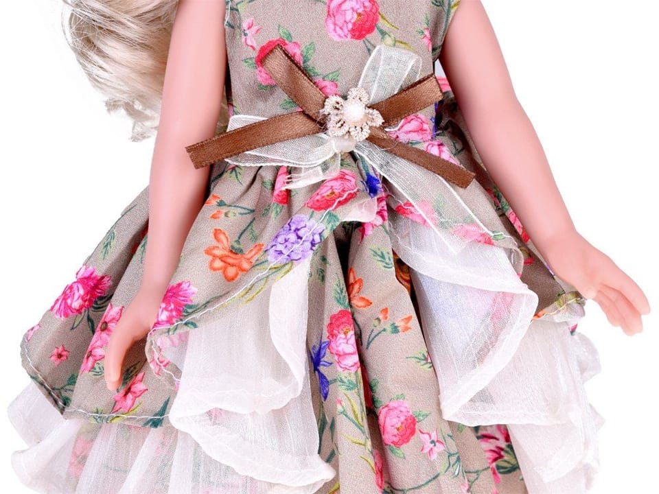 Ta urokliwa lalka jest doskonałym wyborem dla każdej małej miłośniczki mody! Z długimi, blond włosami zaplecionymi w elegancki warkocz, jest ubrana w szykowną, koktajlową sukienkę w kwiaty, ozdobioną falbanami. Stylową całość dopełnia kwiecista opaska na głowie oraz białe pantofelki na stopach. Całość prezentuje się po prostu uroczo!