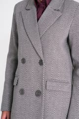 Krój regular. Materiał flausz z widoczną fakturą w jodełkę. Dekolt w literę V z klasycznym kołnierzem. Dwurzędowe zapięcie. Kieszenie z patkami. Skład: 87% poliester, 13% rayon Podszewka: 100% poliester Modelka na zdjęciu ma 176 cm wzrostu i ma sobie rozmiar 36.