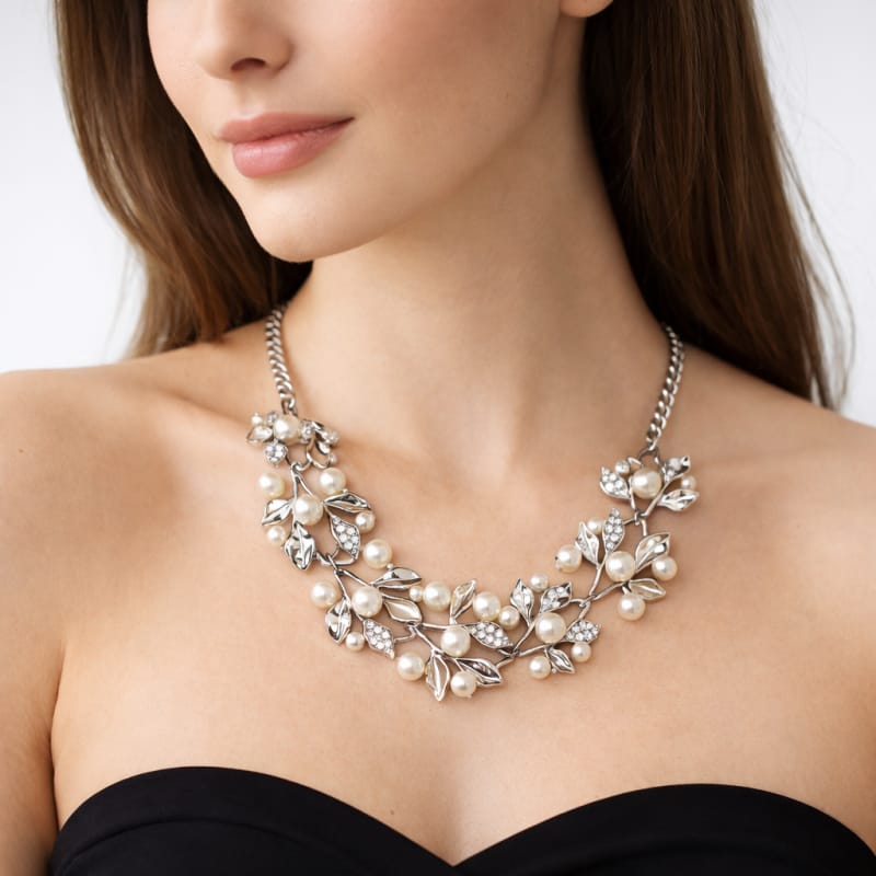 Elegancki Zestaw Biżuterii Naszyjnik + kolczyki z Perłami i Kryształami, Listki srebrne N1072