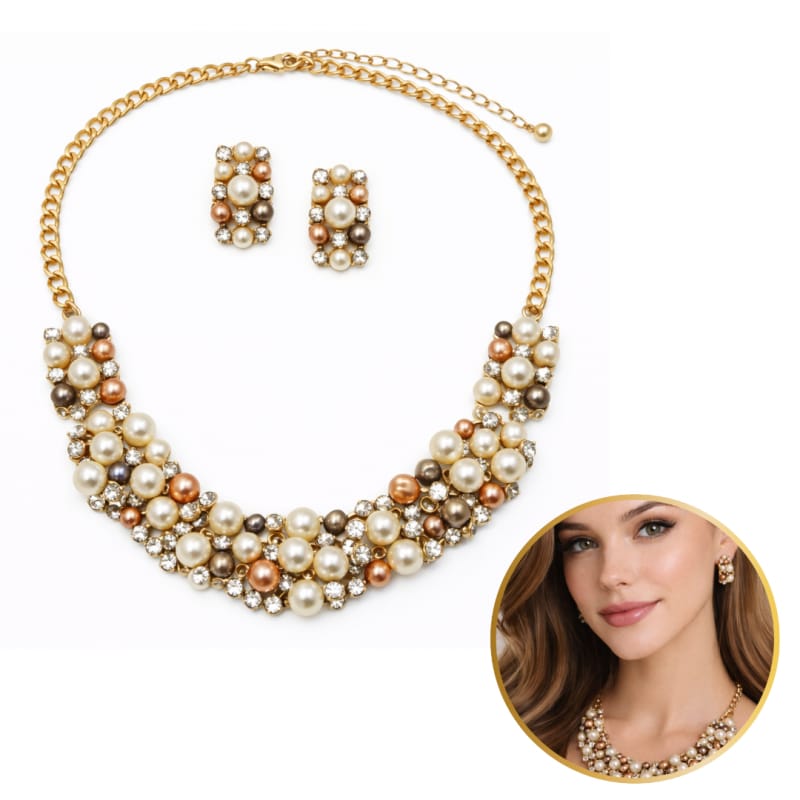 Elegancki Zestaw Biżuterii z Perłami i Kryształami – Naszyjnik + Kolczyki N1070