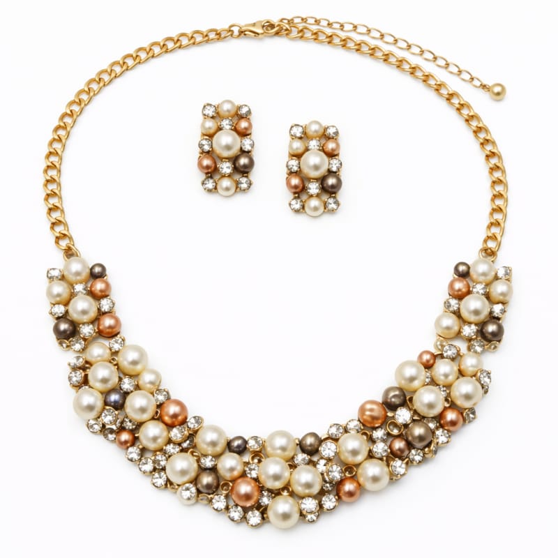 Elegancki Zestaw Biżuterii z Perłami i Kryształami – Naszyjnik + Kolczyki N1070BR