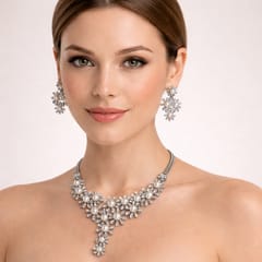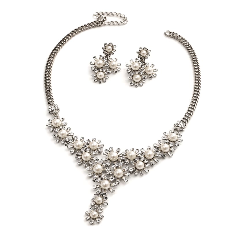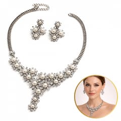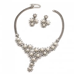 Elegancki Zestaw Biżuterii z Perłami i Kryształami – Naszyjnik + Kolczyki, srebrny N1071S