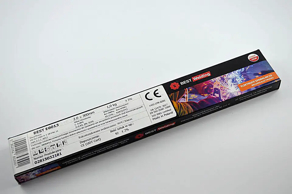 ELEKTRODA RUTYLOWA 2.5mm 350mm 4kg BEST WELDING Elektroda rutylowa powszechnego stosowania do spawania stali konstrukcyjnych we wszystkich pozycjach spawalniczych (Re min. 380MPa) Posiada bardzo dobre własności spawalnicze oraz łatwousuwalny żużel. GWARANCJA JAKOŚCI! Wyprodukowano zgodnie z System Zapewnienia Jakosci ISO 9001 : 2015 E6013 Średnica: 2.5mm Długość: 350mm Waga opakowania: 4kg Ilość sztuk w opakowaniu: 214 (+/-2%) Klasyfikacja EN ISO 2560-A: E 38 0 RC11 AWS A-5.1 :6013 Dopuszczenia CE (UDT Cert) Skład chemiczny C-0,08% Si-0,4% Mn-0,6% Właściwości mechaniczne Re>380 Pa Rm>470 Pa A5>22%, KV.47J( 0? ) 1433-CPR-0201 EN 13479: 2017 EN ISO 2560: 2009 Wszystkie pozycje spawalnicze: PA, PB, PC, PD, PE, PF, PG PRODUKT POLSKI Zdjęcie poglądowe. Producent: Północna Grupa Narzędziowa Sp. z o.o. Adres korespondencyjny: ul. Hurtowa 6, 14-100 Ostróda Adres e-mail: pgn@pgn.com.pl