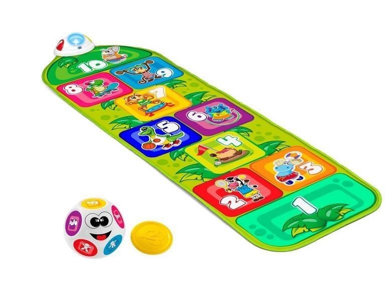 Ulubiona zabawa mamy i taty została rozbudowana o nowe opcje gry i elementy elektroniczne, dla jeszcze lepszej zabawy!Elektroniczna mata z 10 polami, na które trzeba wskoczyć i uroczymi zwierzętami, z którymi zabawa daje wiele radości.Dziecko może skakać słuchając zabawnych dźwięków aktywujących się na każdym polu i bawić się wybierając jeden z dwóch możliwych trybów zabawy. Tryb dobieramy stosownie do wieku i umiejętności dziecka.Gra pomaga dziecku rozwijać umiejętności motoryczne, precyzję i daje naprawdę dużo radości!Tryb 1 - Zabawa w klasyRzuć monetą na matę i skacz, aby ją podnieść, słuchając i rozpoznając przy tym dźwięki i odgłosy zwierząt!Tryb 2 - FitnessRzuć kostką i sprawdź, które ćwiczenie powinieneś teraz wykonać!Kostka składa się z 9 różnych ścianek. Każda z nich to propozycja 1 ćwiczenia bądź szansa na odpoczynek! Zabawa pomaga dziecku rozwijać zdolności motoryczne, precyzję i daje szansę na kreatywną i ciekawą zabawę.