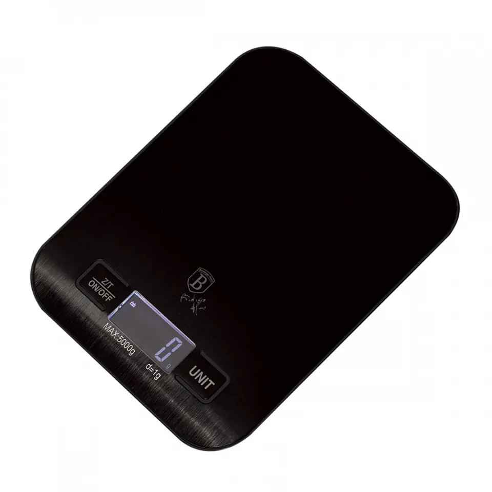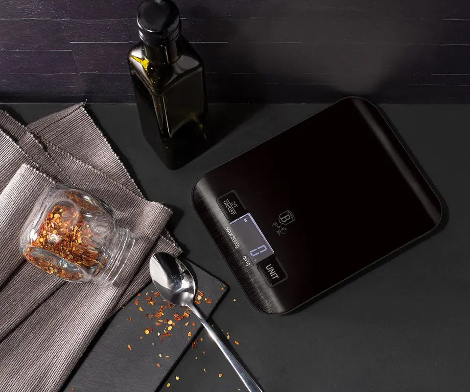 Super płaska waga kuchenna BERLINGER HAUS. Praktyczna i estetyczna w kolorystyce linii Black Silver. Czułość wagi to 1g, a maksymalny ważony ciężar to 5kg. Wskazania wyświetlane są na dużym ciekłokrystalicznym wyświetlaczu LCD. Posiada bardzo wygodną funkcję automatycznego zerowania oraz funkcję TARY. Oznacza to, że składniki można wkładać do miski i odważać po trochu bez wyjmowania poprzednich, które się tam znajdują. Model ten cechuje estetyczne wykonanie z wysokiej jakości materiałów. Wagę można używać z dowolnym naczyniem lub bez. Kolorystyka dopasowana jest do linii naczyń Black Silver Collection