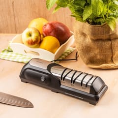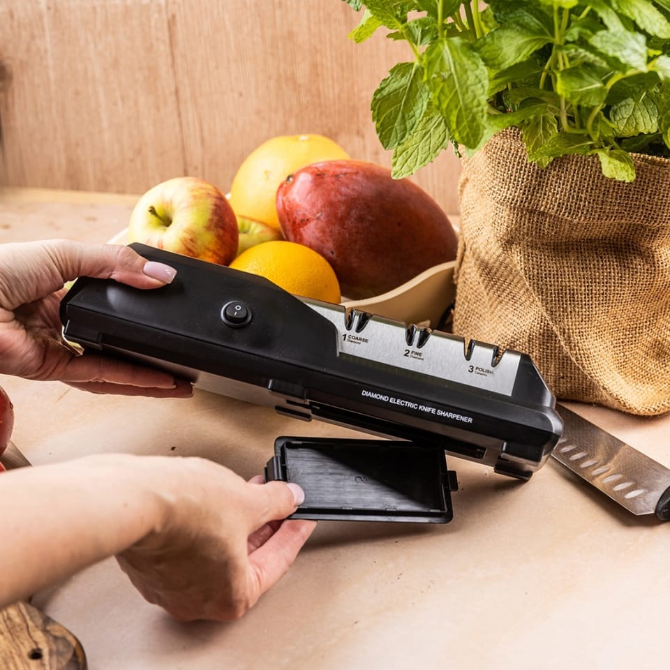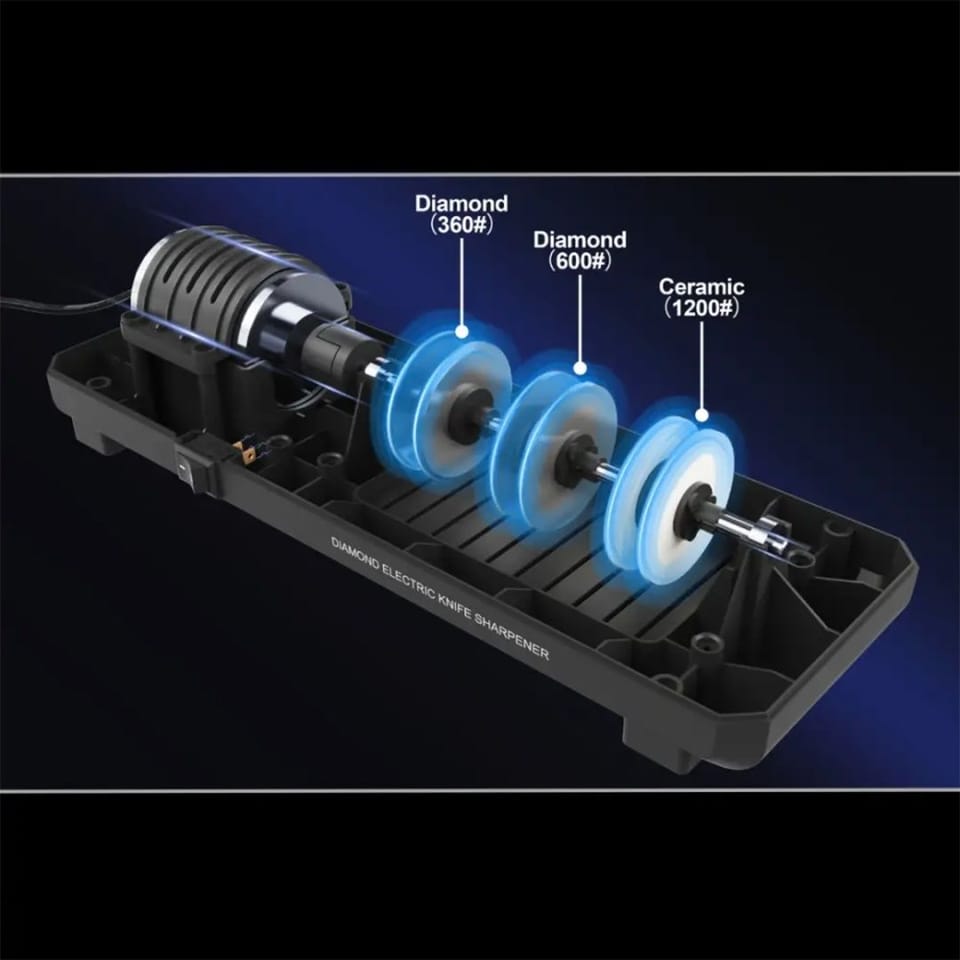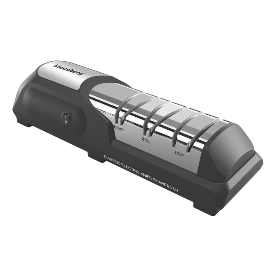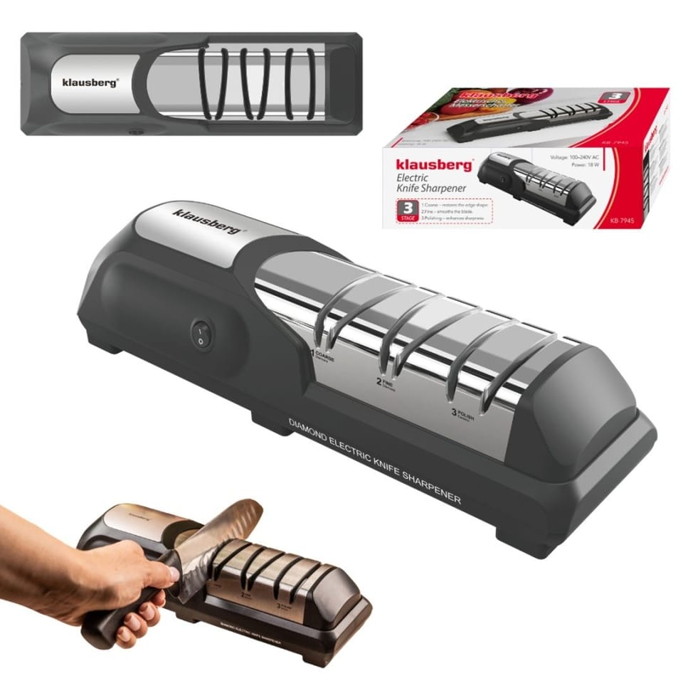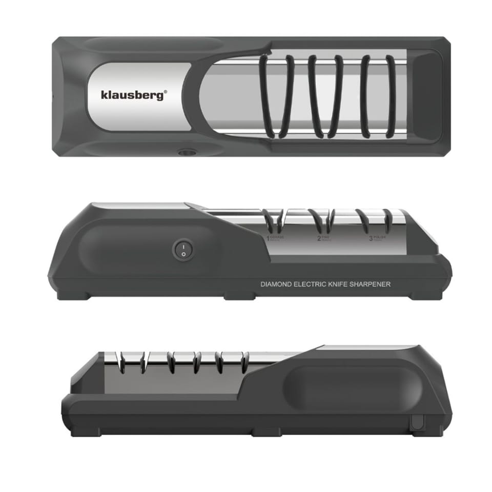 Profesjonalna elektryczna ostrzałka do noży Klausberg to nowoczesne urządzenie, które łączy technologię diamentową z trzystopniowym systemem ostrzenia, gwarantując perfekcyjną ostrość każdego noża – od kuchennego po sportowy. Dzięki precyzyjnym prowadnicom i solidnej konstrukcji, ostrzenie staje się szybkie, bezpieczne i niezwykle skuteczne.