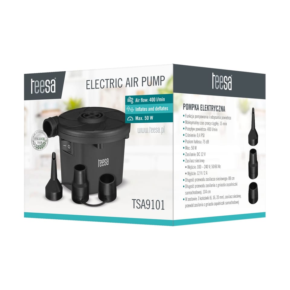 Funkcja pompowania i odsysania powietrzaMaksymalny czas pracy ciągłej: 15 minPrzepływ powietrza: 400 l/minCiśnienie: 0,4 PSIPoziom hałasu: 75 dBMoc: 50 WZasilanie: DC 12 VZasilacz sieciowy: - Wejście: 100 ? 240 V; 50/60 Hz - Wyjście: 12 V / 2 ADługość przewodu zasilacza sieciowego: 88 cmDługość przewodu zasilania z gniazda zapalniczki samochodowej: 104 cmW zestawie: 3 końcówki (6, 16, 20 mm), zasilacz sieciowy (87 cm), przewód zasilania z gniazda zapalniczki samochodowej (105 cm)Waga: 139 gWymiary: 10 x 11,5 x 10 cm