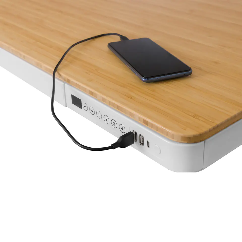 Dosłownie wszystko w jednym miejscu. Biurko zostało wyposażone w sterownik posiadający wyświetlacz LED, przyciski do manualnej zmiany pozycji, 4 programowalne przyciski zapamiętujące pozycje, 2 porty USB, port USB-C (nie należy korzystać z portów USB podczas regulacji wysokości blatu biurka - jeśli zmieniasz wysokość blatu - odłącz urządzenia) oraz funkcję kontroli rodzicielskiej.