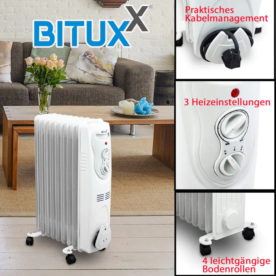Wysokiej jakości grzejnik elektryczny marki Bituxx zapewni ciepło i spokój w Twoim domu. Idealnie sprawdzi się przed sezonem grzewczym, a także w razie nagłej awarii. Urządzenie wyposażone zostało w regulowany termostat, dzięki któremu możesz ustawić temperaturę na 3 poziomach grzania. Dla zapewnienia większego bezpieczeństwa, grzejnik olejowy posiada zabezpieczenie przed przegrzaniem, dzięki czemu samoistnie wyłączy się w przypadku wystąpienia zagrożenia. Dodatkowym atutem grzejnika jest jego oszczędność, po nagrzaniu pozostaje długo ciepły nawet po tym, jak odłączymy go od sieci. Grzejnik emituje przyjemne ciepło co daje ukojenie, a przy tym nie wysusza powietrza. Idealnie sprawdzi się w domku na działce, na wyjeździe z rodziną, czy w warsztacie. Może on dogrzać wszystkie pomieszczenia z dostępem do gniazdka.