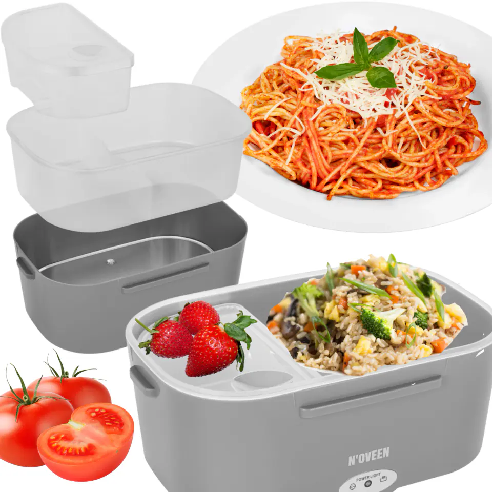 Lunch box wyposażony jest w element grzewczy PTC, który umożliwia podgrzanie jedzenia do 60° C w ciągu 20 minut. Zestaw posiada 2 wyjmowane pojemniki 1,1L oraz 0,5L. Można je myć również w zmywarce