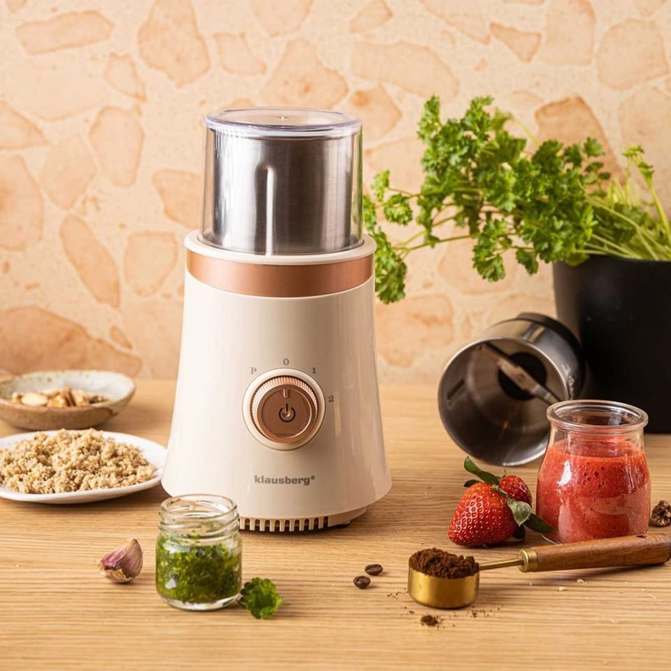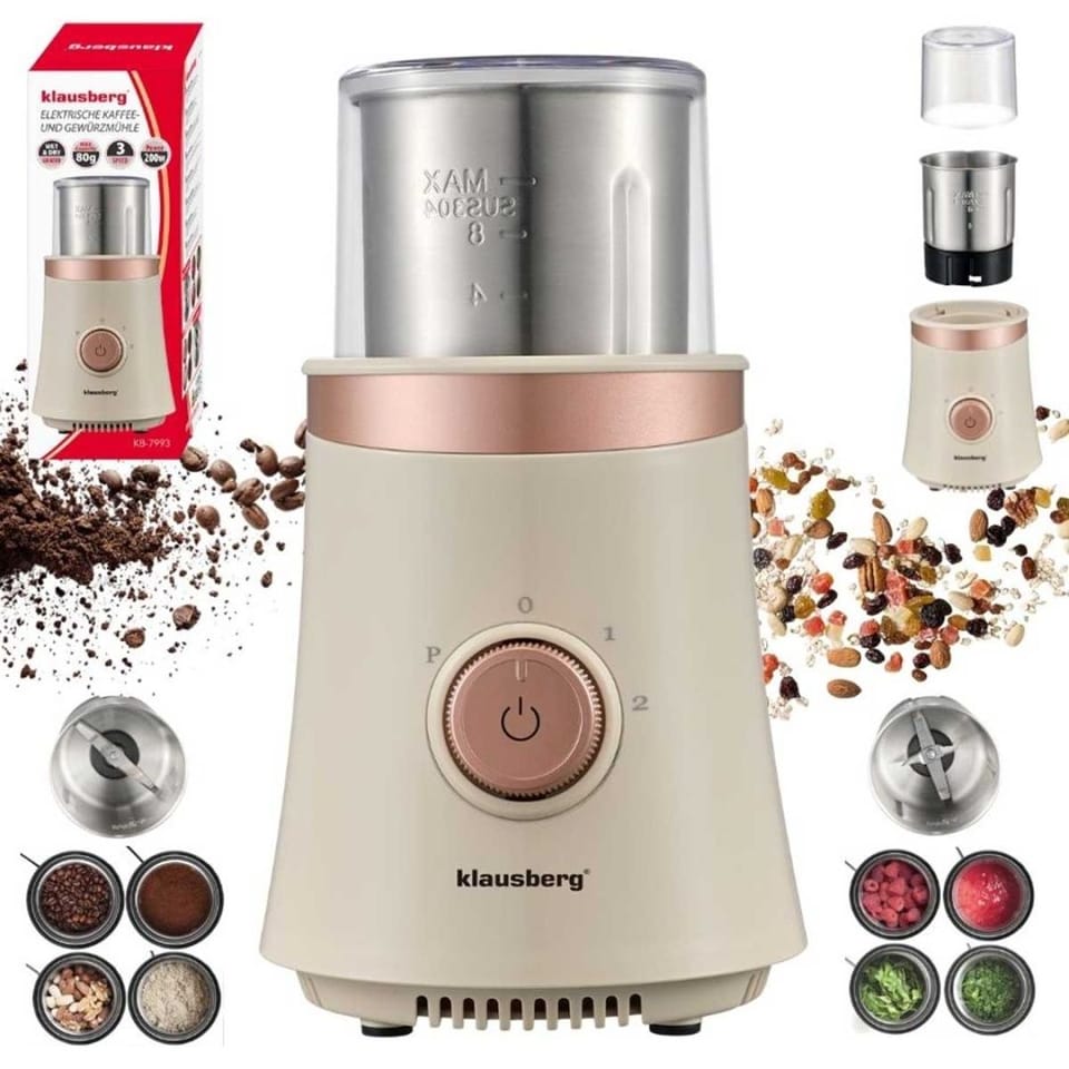 Klausberg KB-7993 to nowoczesny i wielofunkcyjny młynek elektryczny 2w1, umożliwiający mielenie na sucho oraz na mokro. Idealnie nadaje się do kawy ziarnistej, przypraw, ziół, orzechów, a także owoców i warzyw. Jasna, elegancka kolorystyka sprawia, że urządzenie doskonale komponuje się zarówno z nowoczesnymi, jak i klasycznymi aranżacjami kuchennymi.