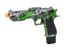 Pistolet wyróżnia się dynamiczną kolorystyką – jest utrzymany w intensywnym zielonym kolorze, który dodaje mu energii i atrakcyjności. Dodatkowo, został ozdobiony srebrnymi elementami, co nadaje mu futurystyczny i nowoczesny wygląd. Co więcej, cała konstrukcja jest udekorowana graffiti, które dodaje mu miejskiego charakteru i unikalnego stylu, przyciągając wzrok i wyróżniając go na tle innych zabawek.