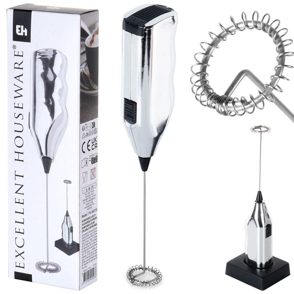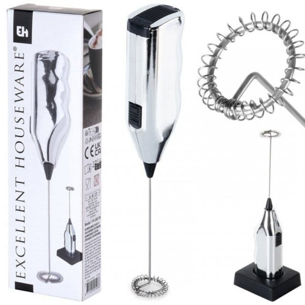 - ELEKTRYCZNY - Ręczny spieniacz elektryczny do mleka o długości 20 cm. Zestaw zawiera stojak na spieniacz. Zasilanie 2 x 1,5V bateria AA (brak w zestawie).