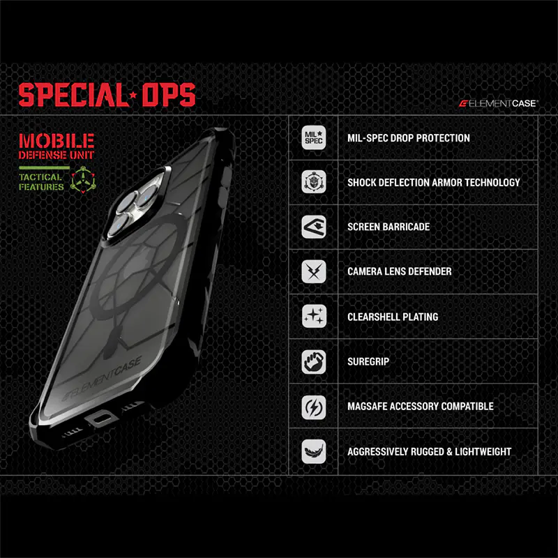 Special Ops firmy Element Case to wysokiej klasy obudowa ochronna o parametrach przewyższających standardy wojskowego certyfikatu MIL-STD-810G. Podwójnie wzmacniana konstrukcja (Shock Deflection Armor Technology) niweluje siły działające na etui oraz iPhone’a podczas gwałtownych upadków na twarde podłoże i nie tylko. Wszystkie krawędzie etui zostały ponadto zaprojektowane w taki sposób, aby zapewnić użytkownikowi maksymalnie wygodny i bezpieczny chwyt, zapewniają tym samym wysoką ergonomię używania telefonu marki Apple.