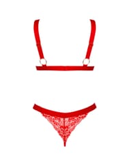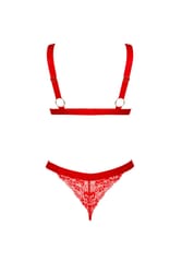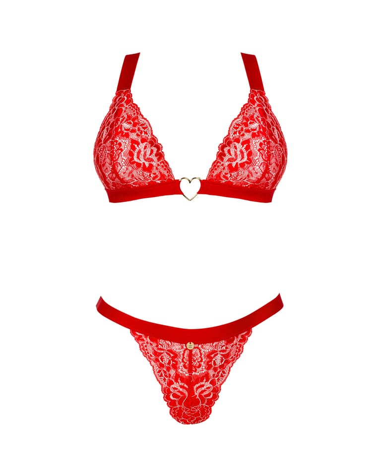 Szukasz czegoś delikatnego i bardzo kobiecego? Daj się zauroczyć tej czerwonej bieliźnie! Dodaj sobie seksapilu i subtelnie rozgrzej atmosferę w Waszej sypialni! Spójrz na eleganckie, koronkowe wykończenia, które wspaniale podkreślą Twoje piękno. Delektuj się wspólnymi chwilami i pozwól porwać się przyjemności.Poznaj więcej szczegółów:- komplet w czerwonym kolorze – stringi i biustonosz- możliwe znakomite dopasowanie dzięki regulowanym ramiączkom oraz kilkustopniowemu zapięciu- uwodzicielskie koronkowe wykończenia- metalowy łącznik w kształcie złotego serca – intrygujący detal- błyszcząca zawieszka – subtelny dodatek- przyjemny w dotyku materiał – zapewnia poczucie komfortu (90% poliamid, 10% elastan)