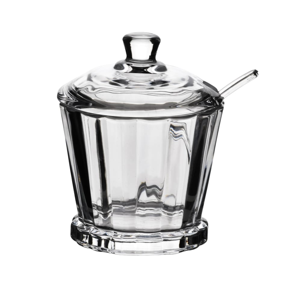 ELISE STRIPES Cukiernica z łyżeczką plastikową 190ml 8,4x7xh12cm.Cukiernica ELISE STRIPES o pojemności 190 ml i wymiarach 8,4 7 12 cm wykonana jest ze szkła sodowego, ozdobionego pionowymi, żłobionymi pasami, które nadają jej elegancki i stylowy wygląd. Praktyczna pokrywka wyposażona jest w otwór na łyżeczkę, co ułatwia codzienne użytkowanie. Produkt nadaje się do mycia w zmywarce, a dzięki estetycznemu, pojedynczemu opakowaniu typu eco box doskonale sprawdzi się również jako prezent.