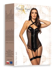 Ella Noir set to wyjątkowy komplet, w którym odważny charakter spotyka się z wyrafinowaną elegancją. Wetlook w połączeniu z prześwitującym tiulem tworzy hipnotyzujący efekt, który podkreśla kształty i przyciąga spojrzenia. Ozdobny zamek błyskawiczny z przodu dodaje pazura, a przezroczysty tył uwodzicielsko odsłania ciało.