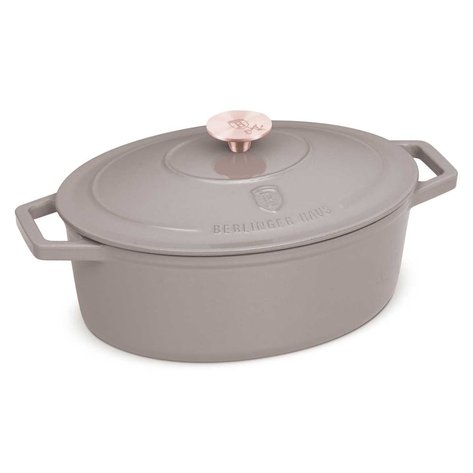 Brytfanna żeliwna 30cm o pojemności 4,65l z pokrywą. Z zewnątrz pokryta emalią w kolorze szarym. Wnętrze pokryte emalią w kolorze czarnym. Linia naczyń Taupe Collection.