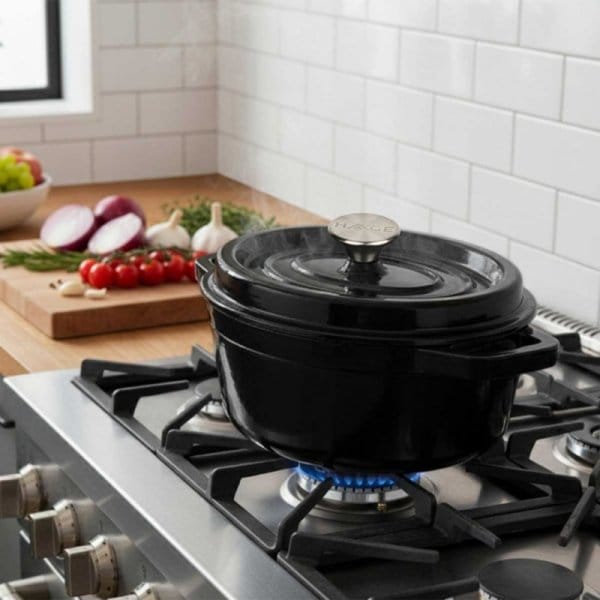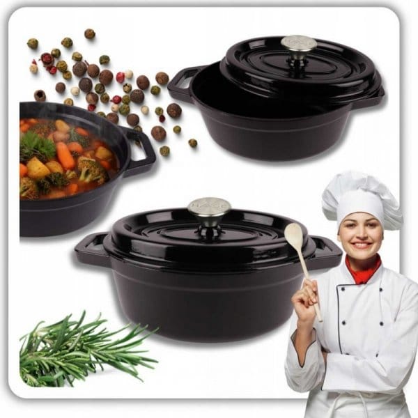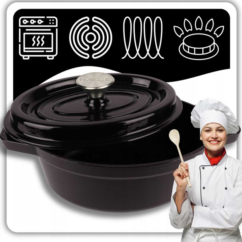 - Elegancki Wygląd i Funkcjonalność: Piękna emalia w kolorze czarnym nie tylko nadaje naczyniu wyjątkowego charakteru, ale również chroni żeliwo i ułatwia jego czyszczenie. Brytfanna będzie ozdobą zarówno w kuchni, jak i na stole.